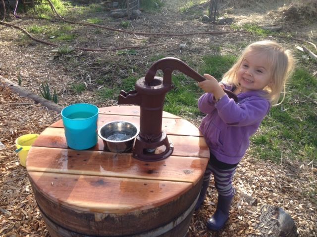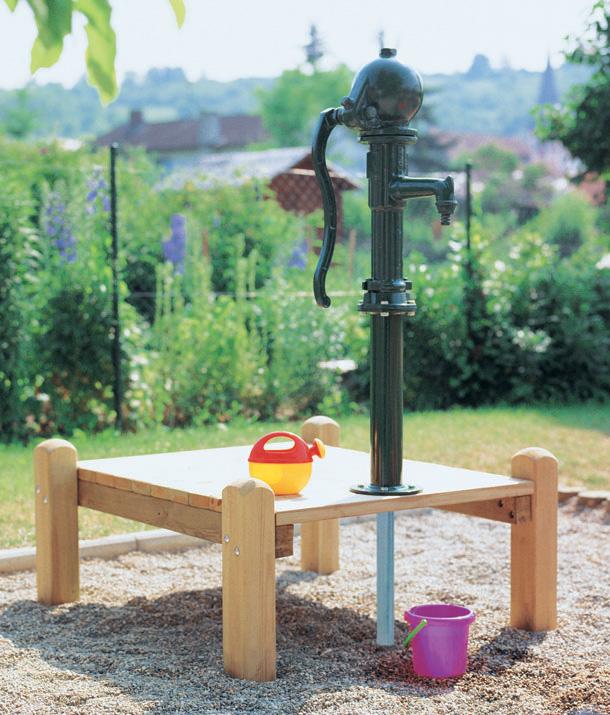 They can be used in many ways in play environments. One of my favorites is portable pump stations like the ones below that I build over the years. The pumps, installed on platforms, pull water from the tubs. These stations can be easily relocated as needed and don’t require the financial expenditure of digging a well or hard plumbing a hand pump on your playground.