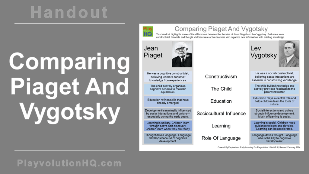 Here’s a free handout comparing Piaget and Vygotsky. Jean Piaget and Lev Vygotsky were both constructivist theorists and thought children were active learners who organize new information with existing knowledge, but their views were not always in sync.