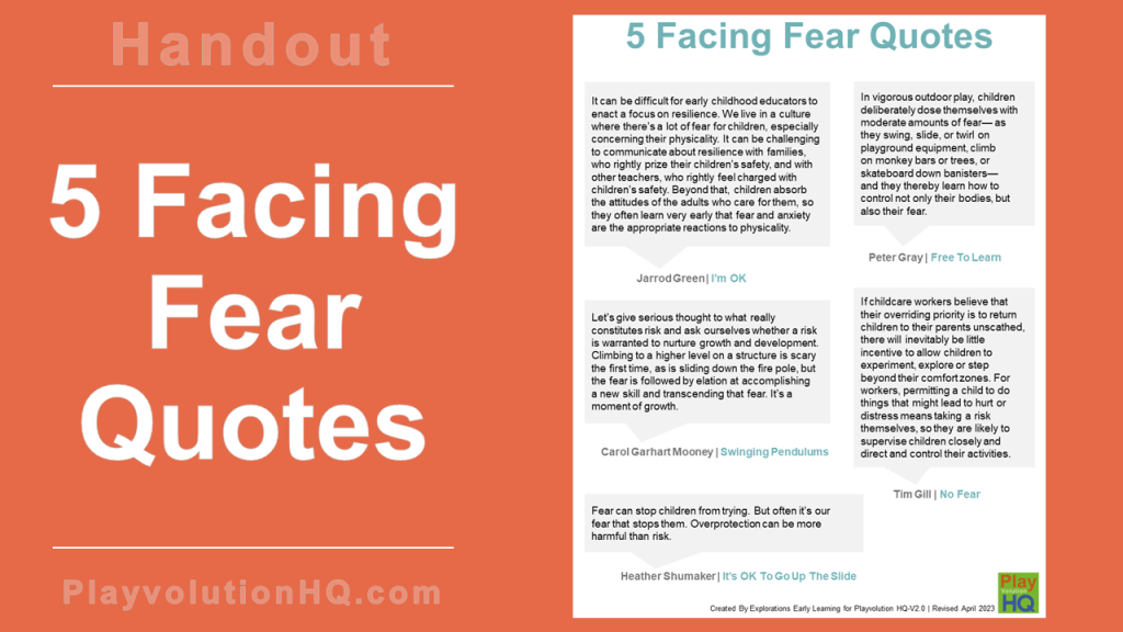 Here’s a free one-page handout with 5 of my favorite quotes about facing fear, children, and early learning. These quotes can help adults better understand fear, risk-taking, and their role in early learning. As these quotes explain, adult fear can be a big roadblock to children’s self-directed play and exploration.