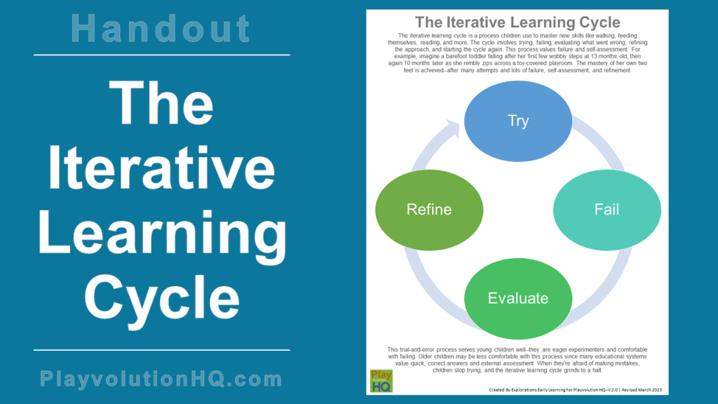 The iterative learning cycle is a process children use to master new skills like walking, feeding themselves, reading, and more. The cycle involves making an attempt, failing, evaluating what went wrong, refining the approach, and starting the cycle again. This process values failure and self-assessment.