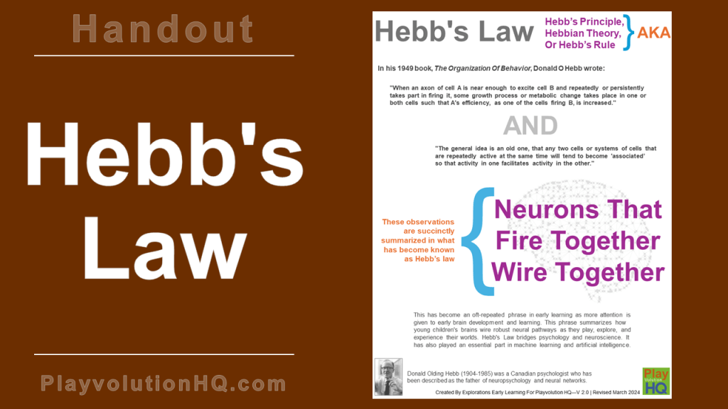 Over the last few decades, this has become an oft-repeated phrase in the early learning world as more attention is given to early brain development and learning. This phrase succinctly summarizes how young children’s brains wire robust neural pathways as they play, explore, and experience their worlds. Hebb’s Law bridges psychology and neuroscience. It has also played an important part in the fields of machine learning and artificial intelligence.