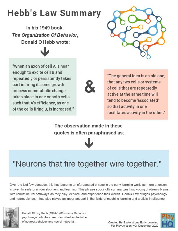 Over the last few decades, the paraphrasing has become an oft repeated phrase in the early learning world as more attention is given to early brain development and learning. This phrase succinctly summarizes how young children’s brains wire robust neural pathways as they play, explore, and experience their worlds. Hebb’s Law bridges psychology and neuroscience. It has also played an important part in the fields of machine learning and artificial intelligence.