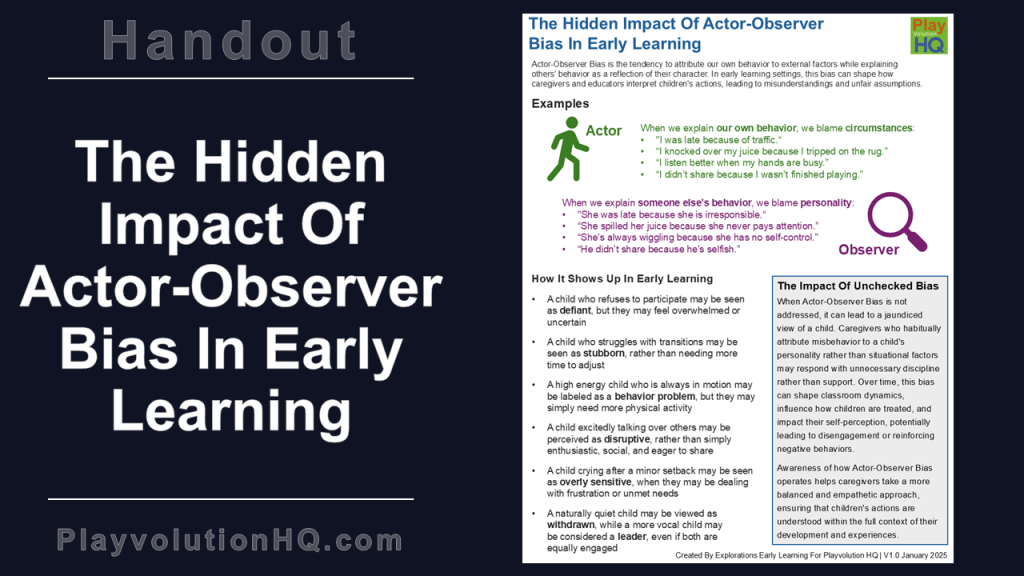 This handout breaks down the impact of actor-observer bias, offering clear examples of how it manifests in early learning settings. It contrasts how adults explain their actions versus children’s, highlighting the consequences of this bias when it goes unrecognized. By understanding these patterns, caregivers can take a more balanced, empathetic approach that ensures children’s behaviors are viewed in a fuller and fairer context.