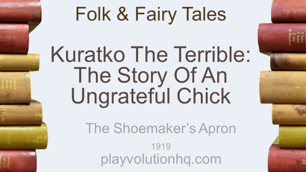 “Cockadoodledo!” Kuratko said. “I should think my crop was big for haven’t I just eaten Grandmother, spinning-wheel and all, and Grandfather, stool and all? But I’m still hungry, so now I’m going to eat you!”