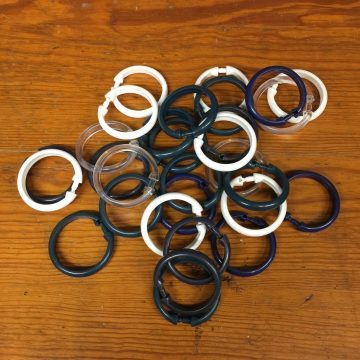 Shower curtain rings as loose parts: sort them, count them, string them, wear them as earrings, create mosaics with them, throw them, use them as pirate treasure, wear them as bracelets, and more.
