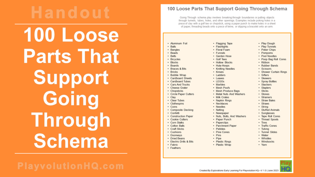 Here’s a free handout with 100 loose parts that support going through schema play. This list will help you stock your early learning play space to support children exploring going through schema. This schema involves play involves breaking through boundaries or putting objects through tunnels, tubes, holes, and other openings. Find more on this schema here and schema play theory here.