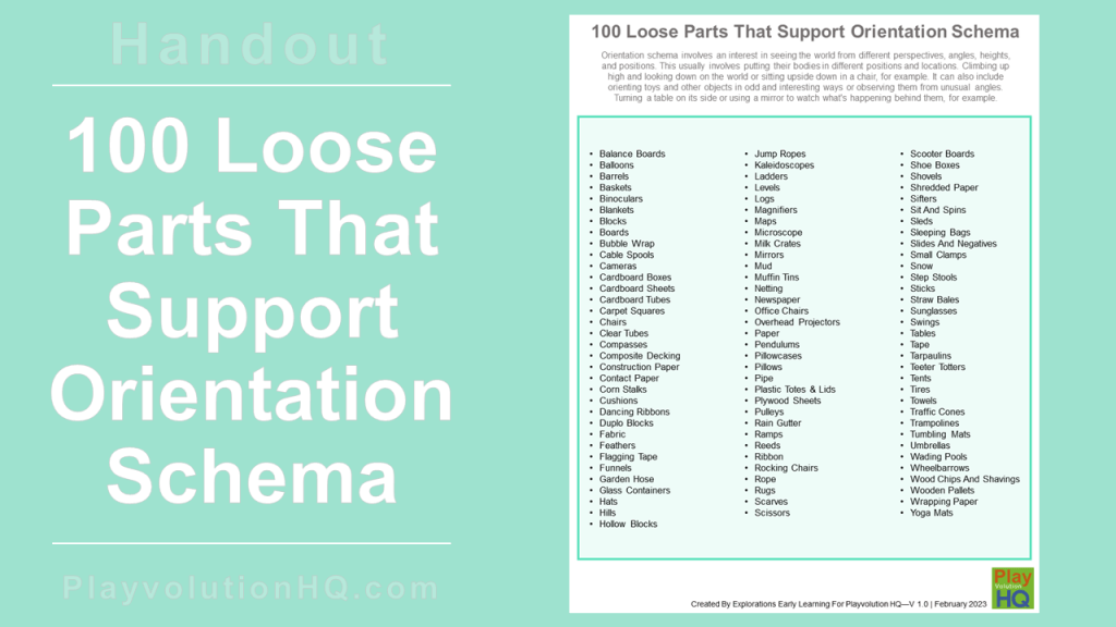 Here’s a free handout with 100 loose parts that support orientation schema play. This list will help you stock your early learning play space to support children exploring this schema.