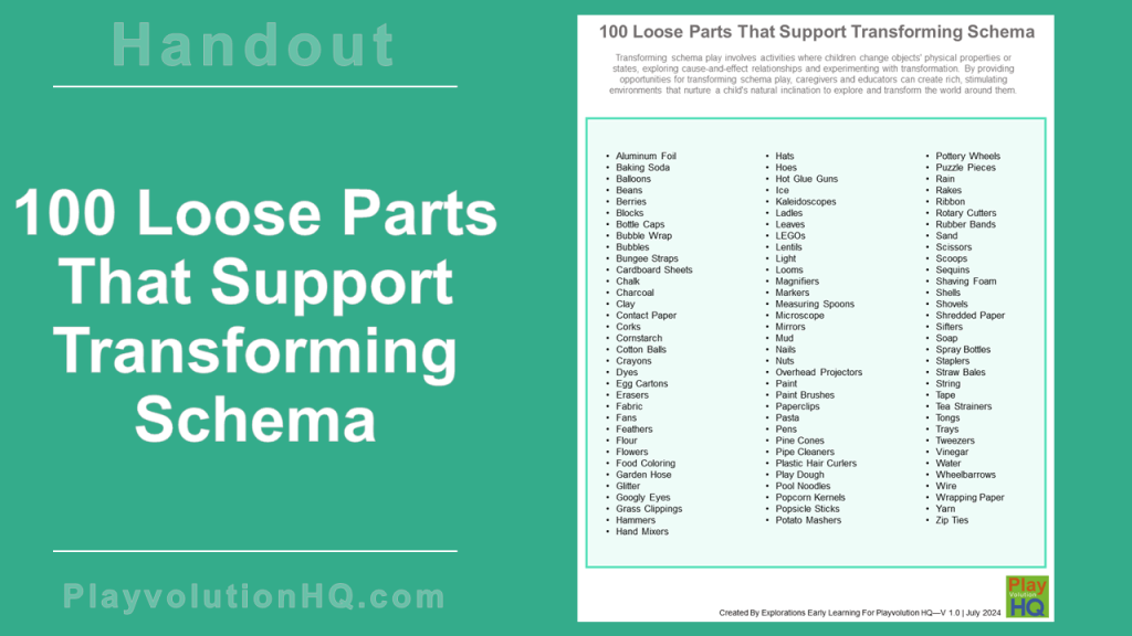Here’s a free handout with 100 loose parts that support transforming schema play. This list will help you stock your early learning play space to support children exploring this schema. Transforming schema play involves changing objects’ physical properties or states, exploring cause-and-effect relationships, and experimenting with the concept of transformation. Find more on this schema here and schema play theory here.