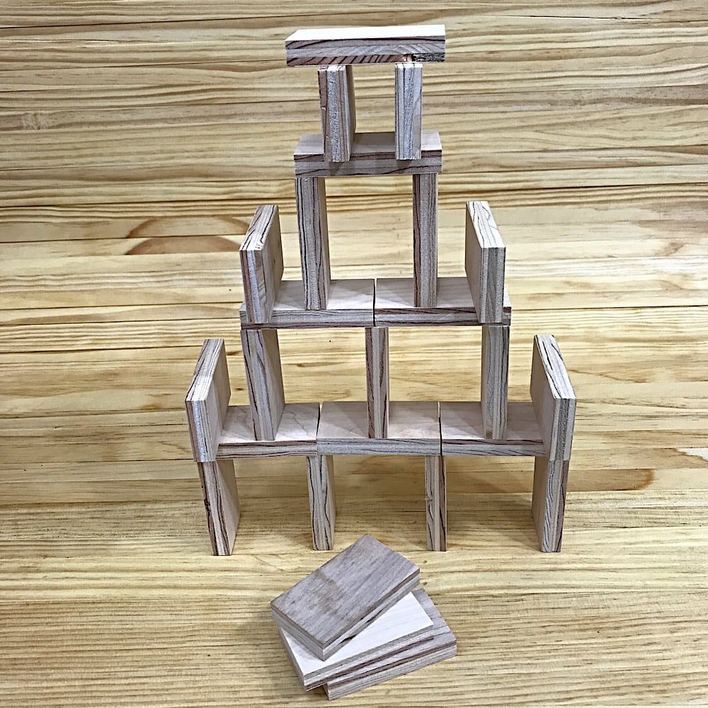 You’ll need a sheet of 1/2” baltic birch plywood. A 4’x8’ sheet costs around $75. That should result in 1122 blocks if you follow the directions below and I calculated correctly. Some lumber yards sell half or quarter sheets. You could use other types of plywood, but in my experience, baltic birch is the best option.