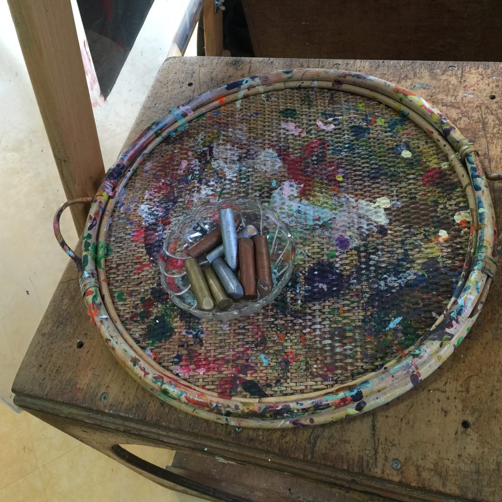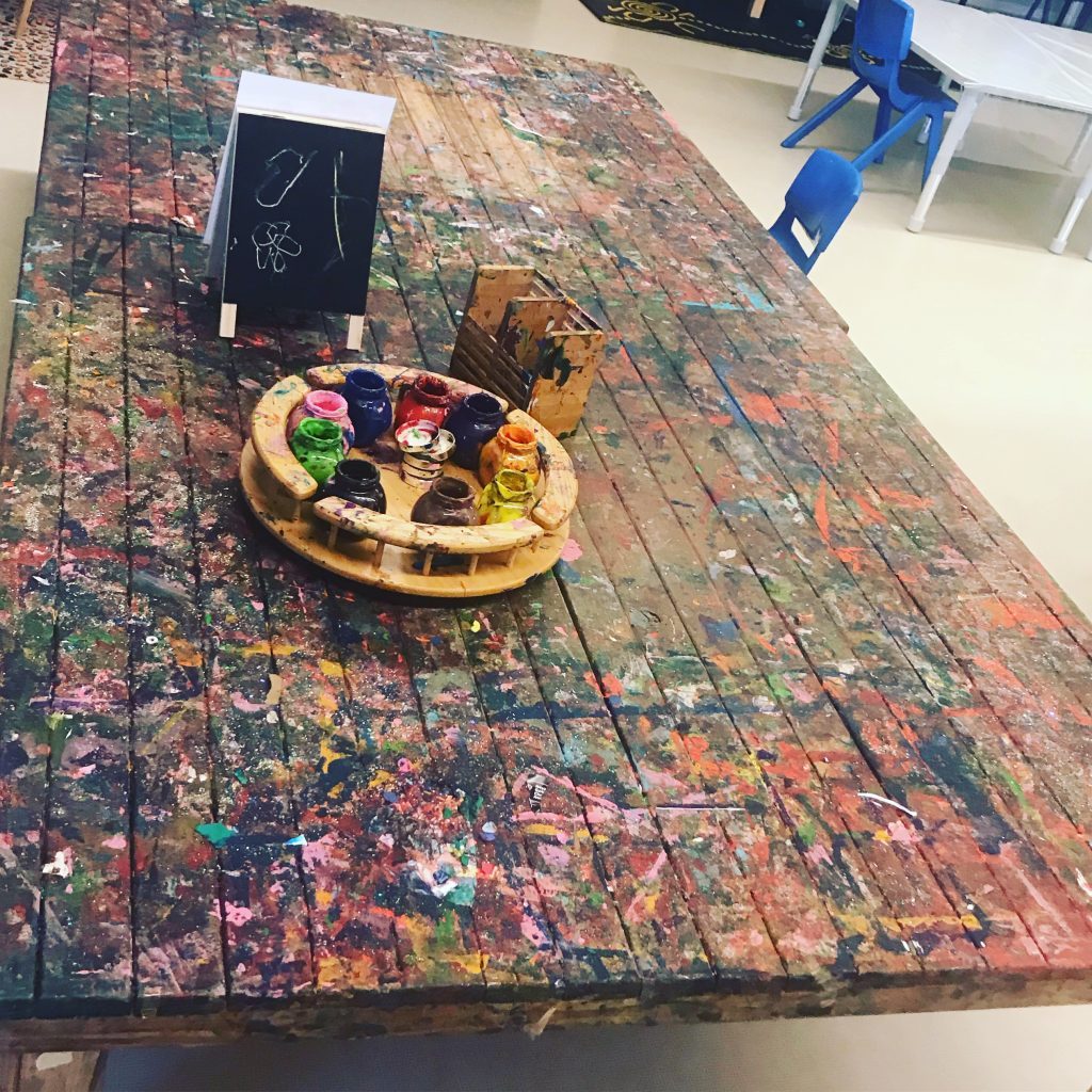 One way to avoid that LOTF vibe is to have designated mess management items like the woven tray below. Notice how it is splattered with paint while the surface it sits on is relatively paint-free.