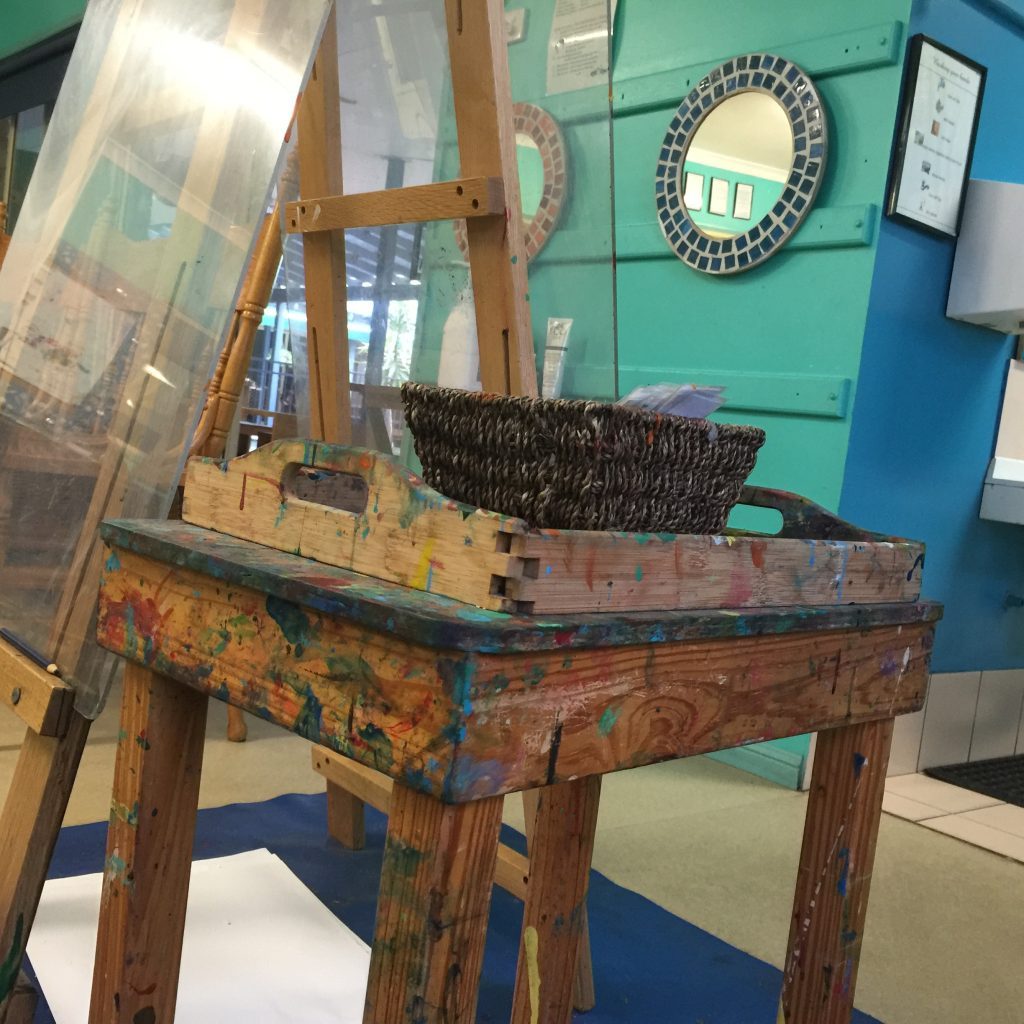 The easel is nearly spotless, but the table and tray tell are splattered with play and exploration.