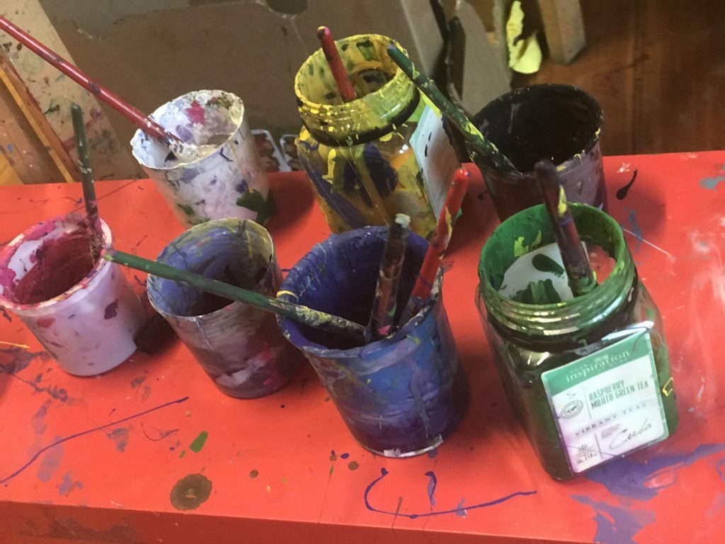 Sam’s concerned the lids won’t fit on the paint pots due to the caked color and wants to give them a scrubbing. They may indeed need it.