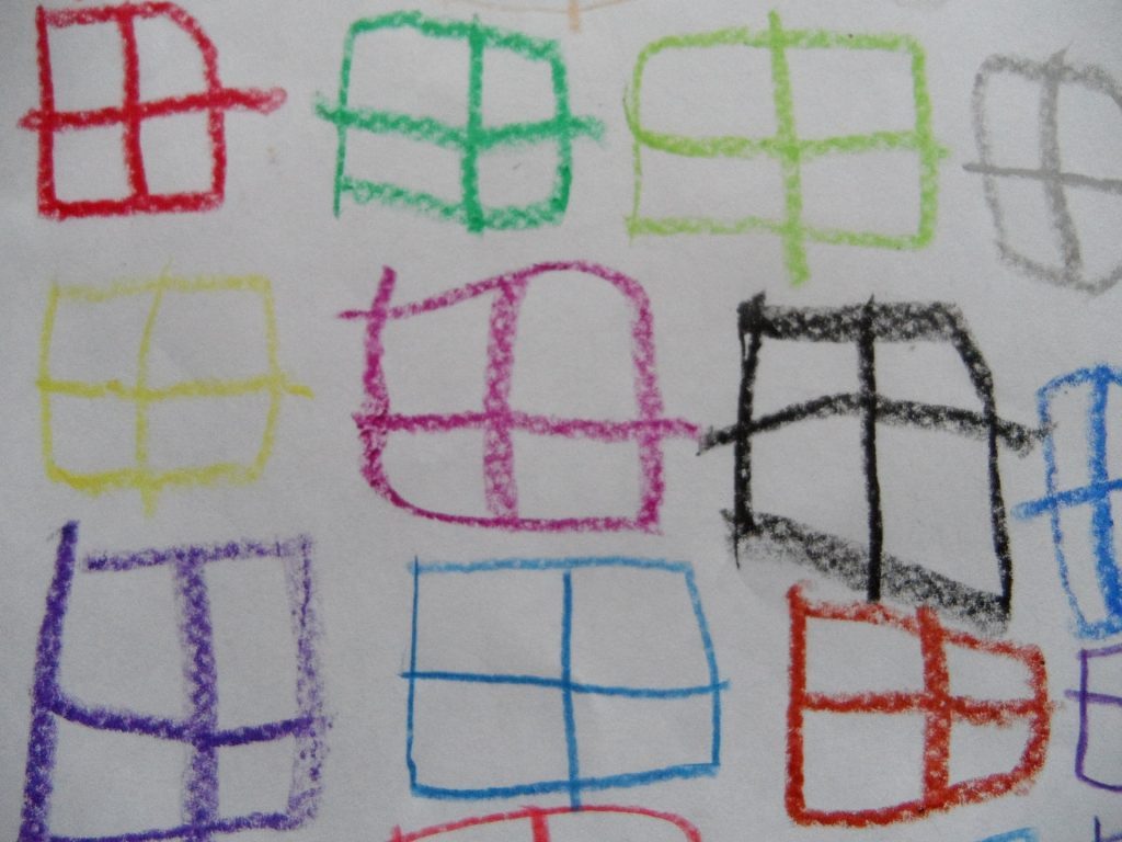 Children also explore positioning schema in the process art area. For example, in the drawing below, a child arranged a series of windows in neat rows and columns.