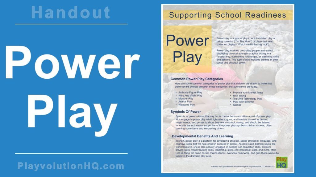Power play is a type of play in which children play at being powerful (“I’m The Mom”) or place their real power on display (“Watch me lift that big rock”). It involves controlling people and events, displaying physical strength or agility, acting forcefully, overcoming challenges, or exhibiting skills and abilities. This type of play includes exhibits of both social and physical power.