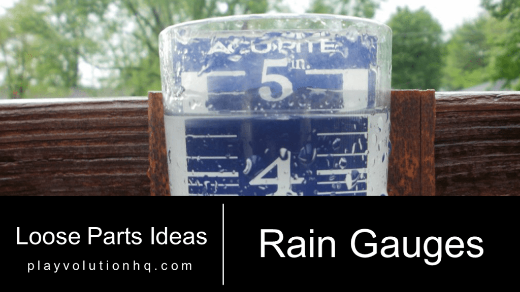 Rain gauges as loose parts in your outdoor play area provide kids a chance to bump up against early numeracy skills, learn about rain, gain understanding of cause and effect relationships, and maybe learn about life and death. “Miss Beverly, if it doesn’t rain soon, the rutabagas, radishes, and radicchio we planted in the garden During R week might die! I better get the hose!”