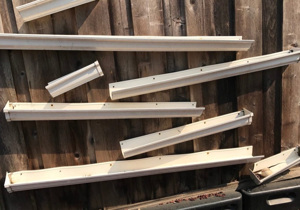 Rain gutters are available in a variety of materials.  I recommend using the vinyl variety. It’s less expensive, easier to cut, and safer to use. The metallic options are slightly more durable, but their sharp edges don’t play well with young children.
