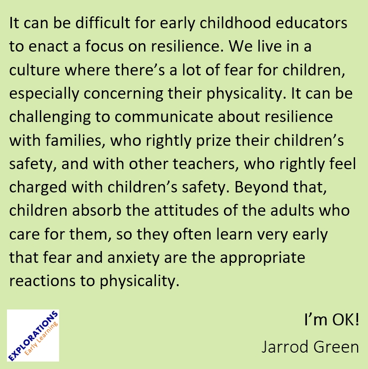 Resilience is the mental and emotional process of managing stress and recovering from difficulties, challenges, trauma, and adversity. Factors such as personal world-view, available social resources, and coping strategies contribute to how one handles adversity. From skinned knees, to the death of a loved one, to prolonged physical and emotional abuse, there’s no end to the situations requiring resilience that life tosses in your path. Since resilient individuals recover faster and more completely from challenging experiences, it is important that young children develop this skill.