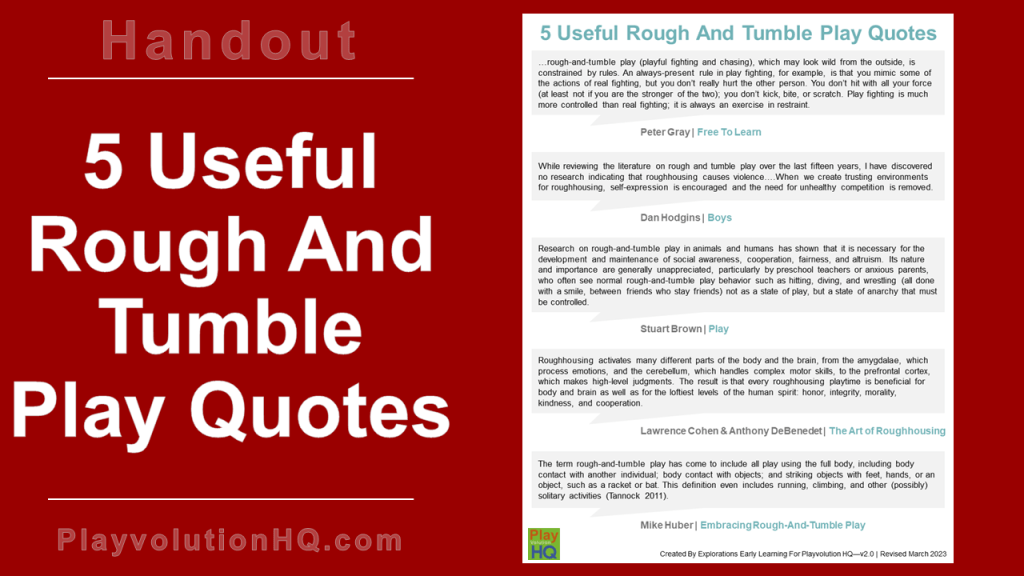 Here’s a free one-page handout I put together with some of my favorite rough and tumble play quotes. It features quotes from books by Peter Gray, Dan Hodgins, Stuart Brown, Lawrence Cohen & Anthony DeBenedet, and Mike Huber. You’re welcome to download and use it as you like.