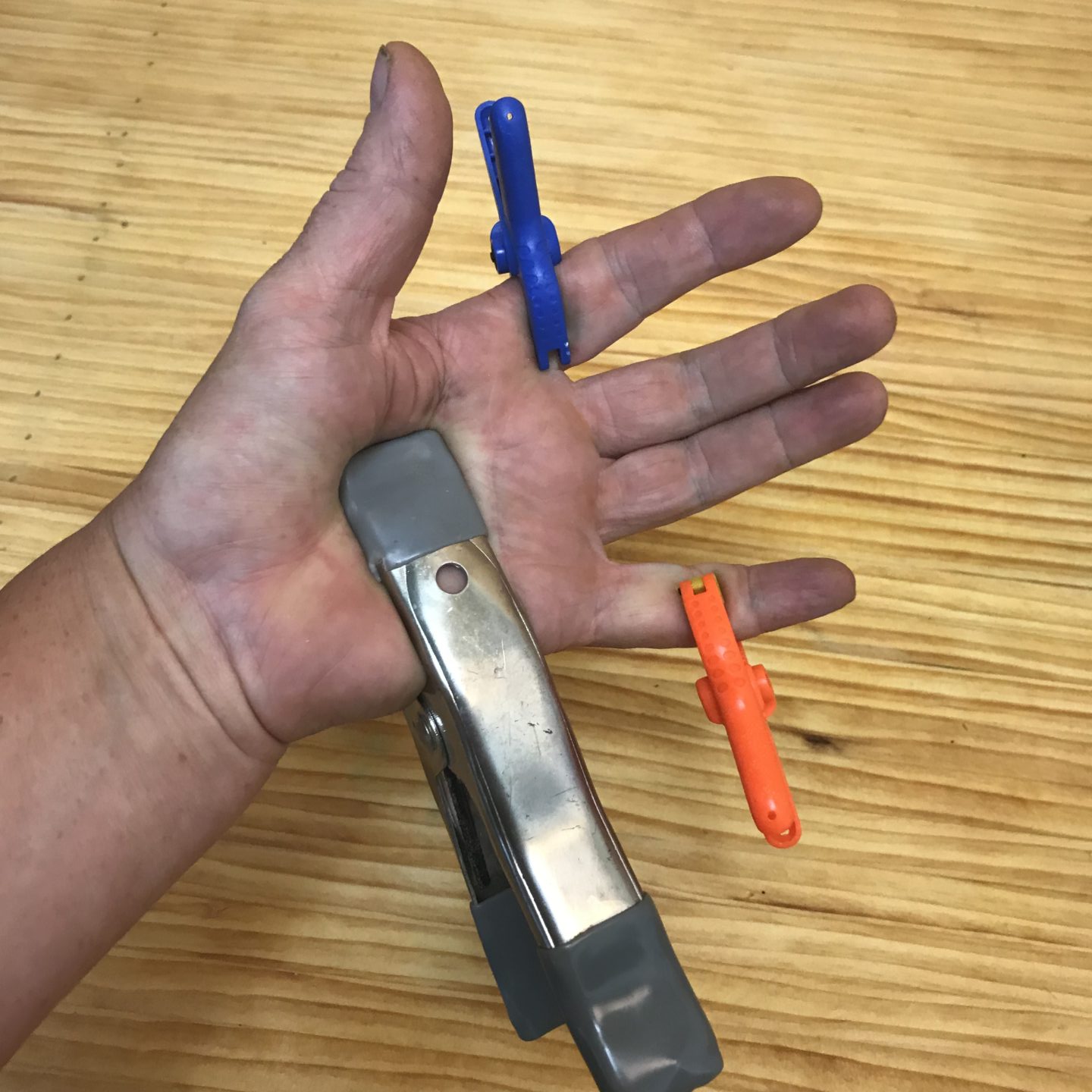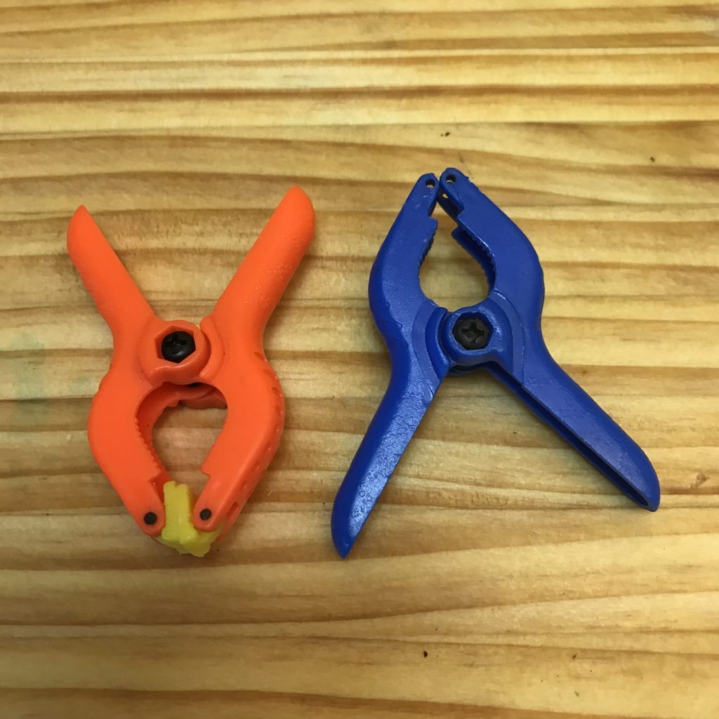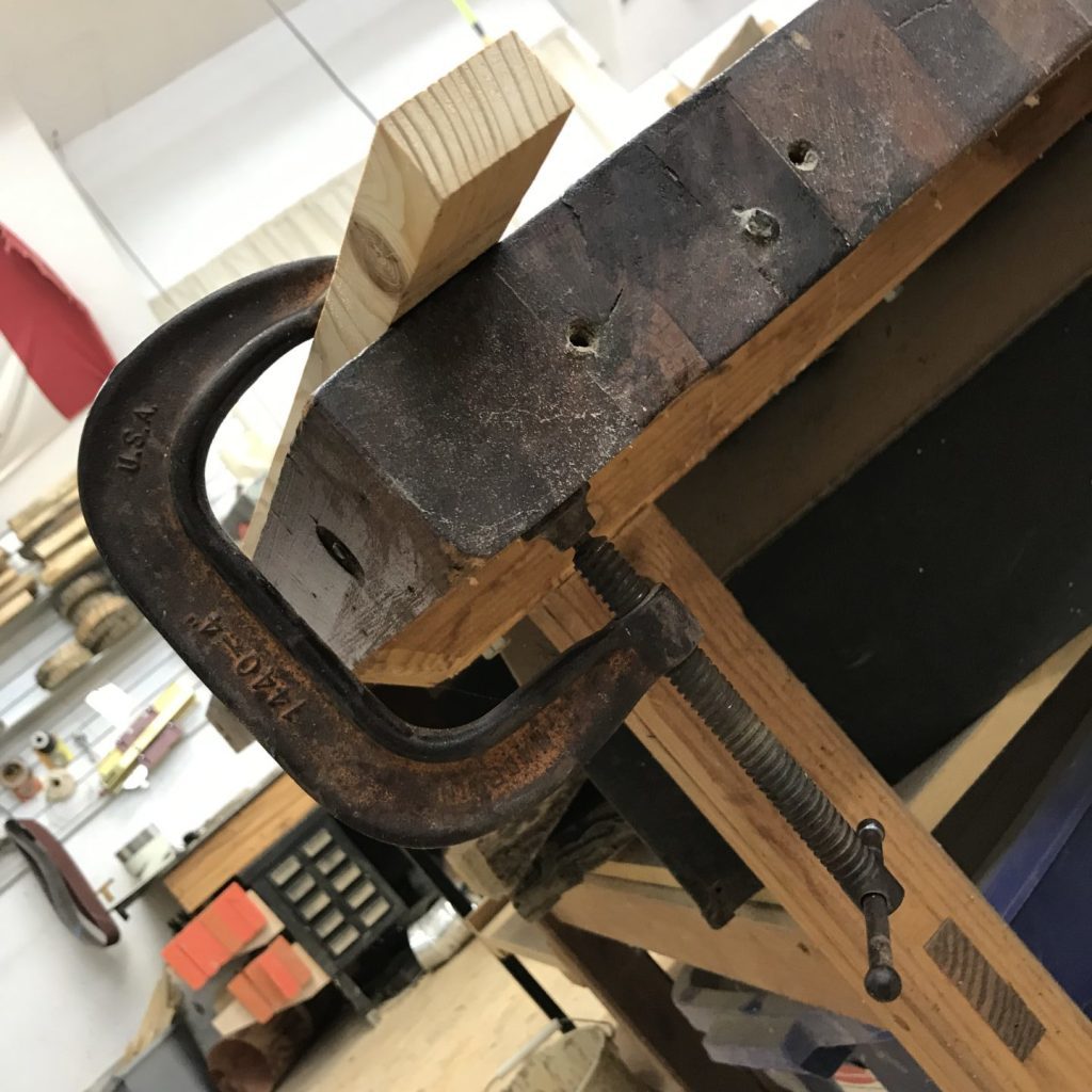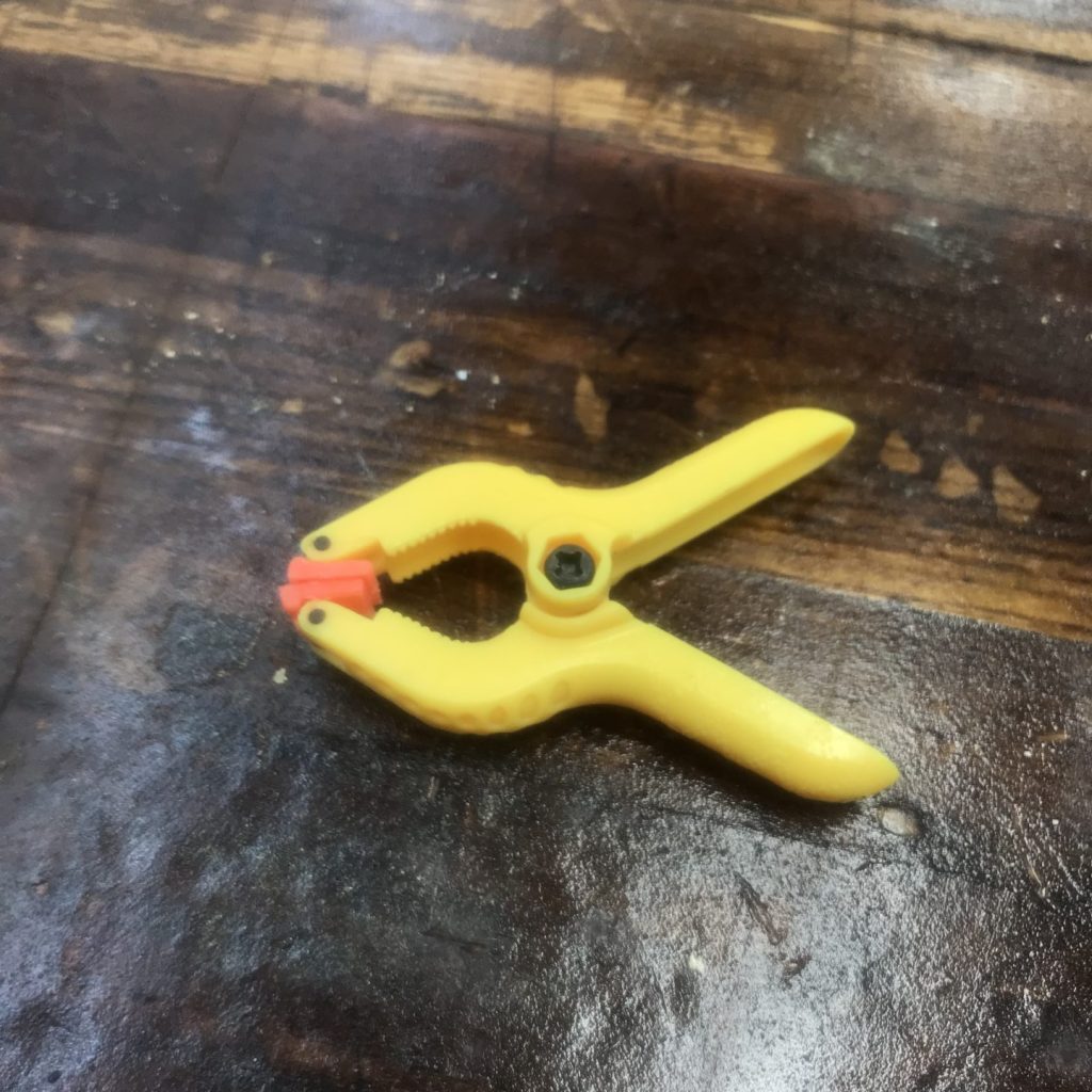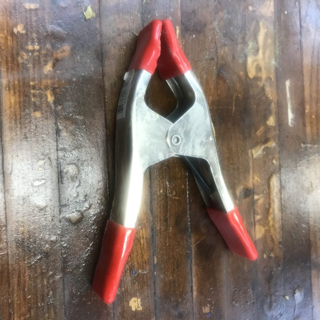 And, I still think you should have some C clamps around for three reasons. First, they’re novel and that’ll make them interesting to some children. Second, because they operate differently, kids challenge their bodies differently when using C clamps. They require a twisting motion instead of a pinching motion, they usually require the use of both hands, and they tend to be more challenging for young humans to use. Third, since they can apply much more force than spring clamps, kids have to practice being careful/thoughtful when using C clamps. C clamp use is a chance for kids to practice their judgment–is this tight enough? Did I make it too tight?