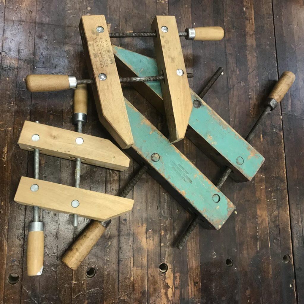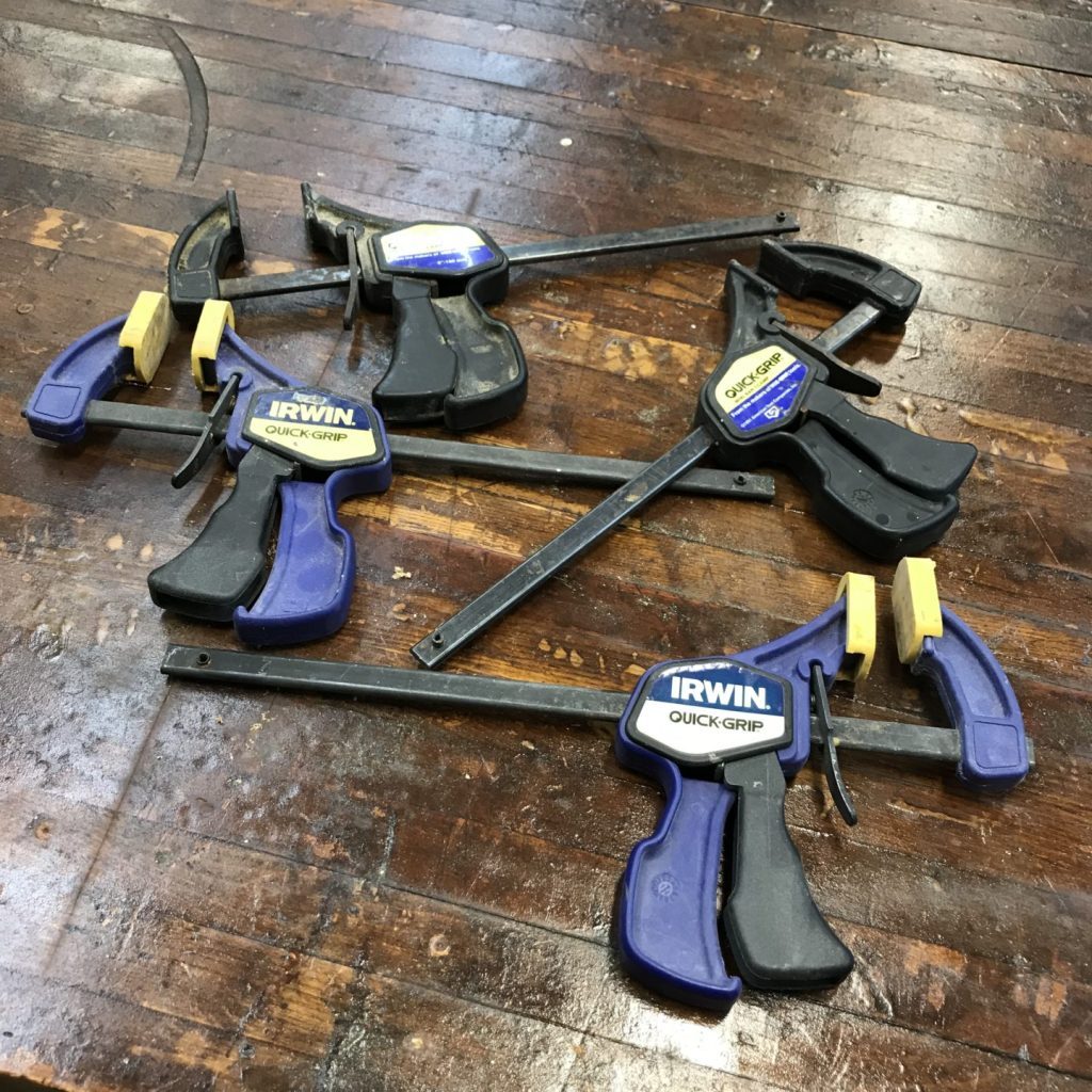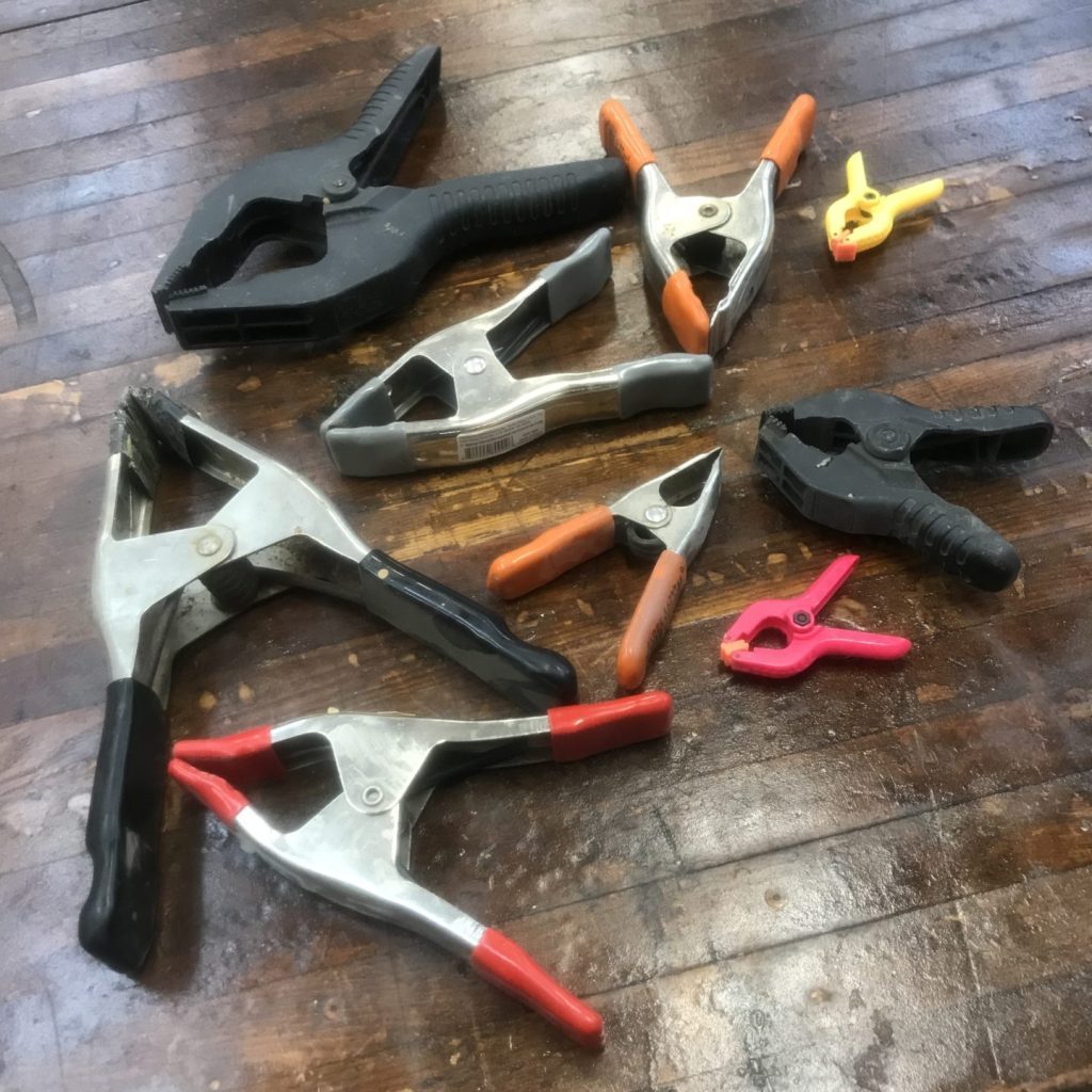 These clamps come in a variety of sizes. I’d recommend building up a collection of half a dozen in the 2-6 inch range. These clamps will also probably require a bit more supervision than spring clamps.