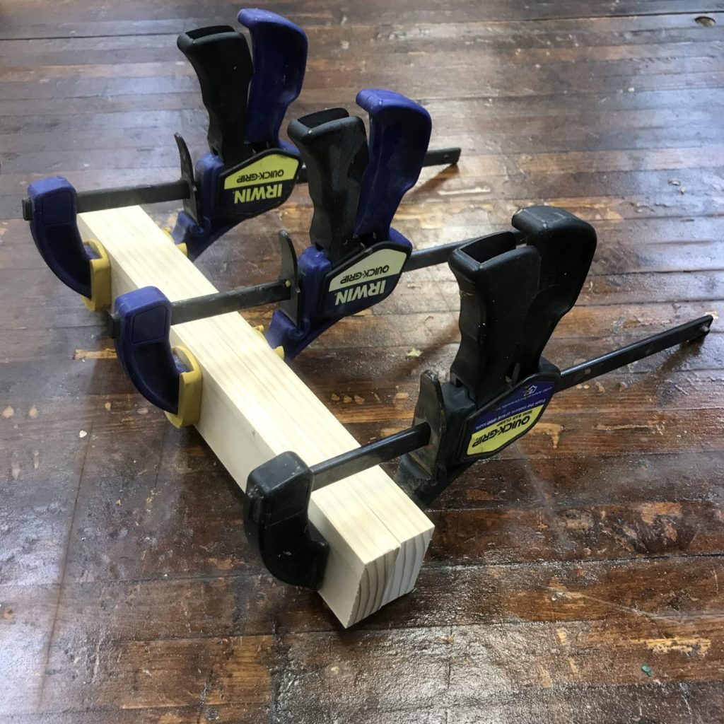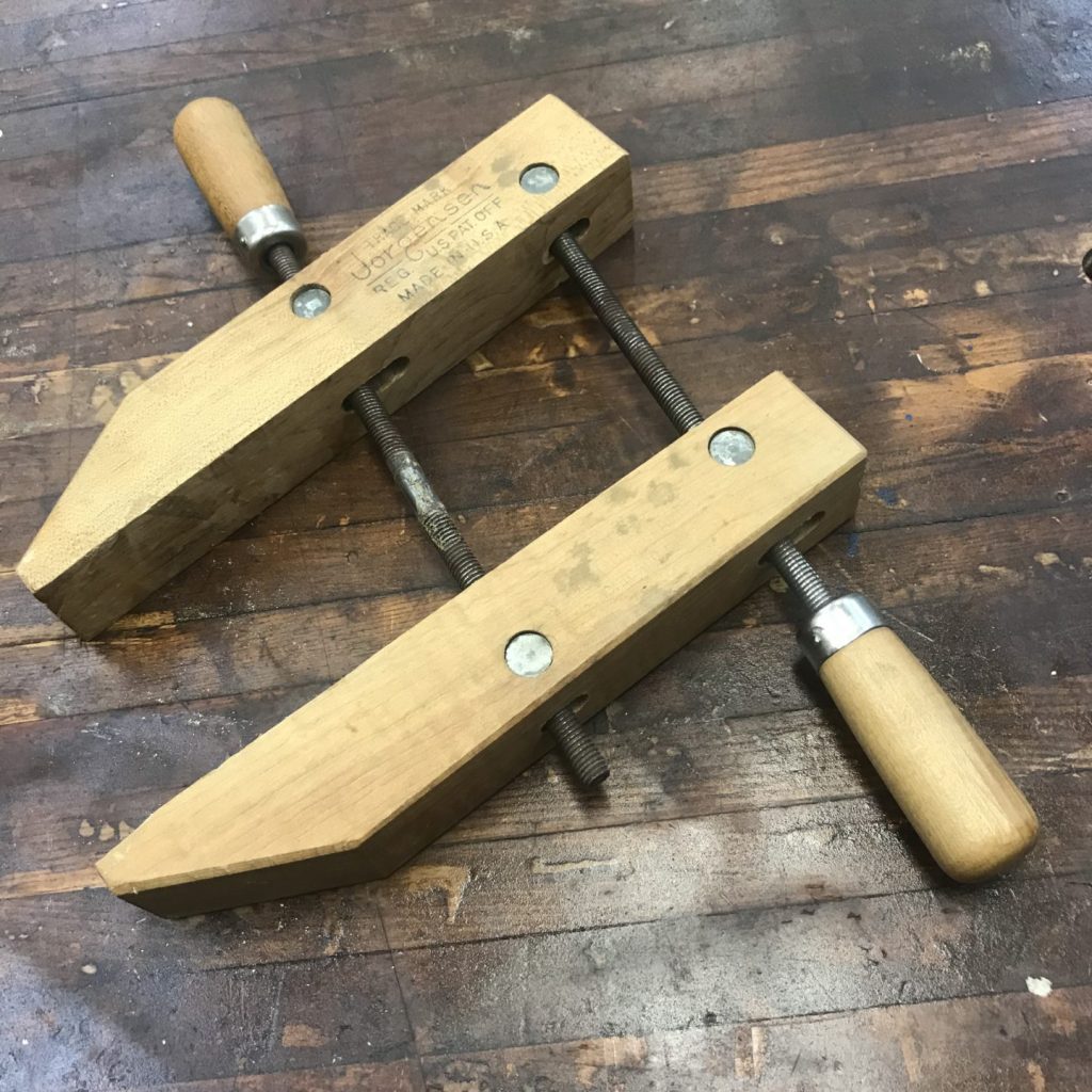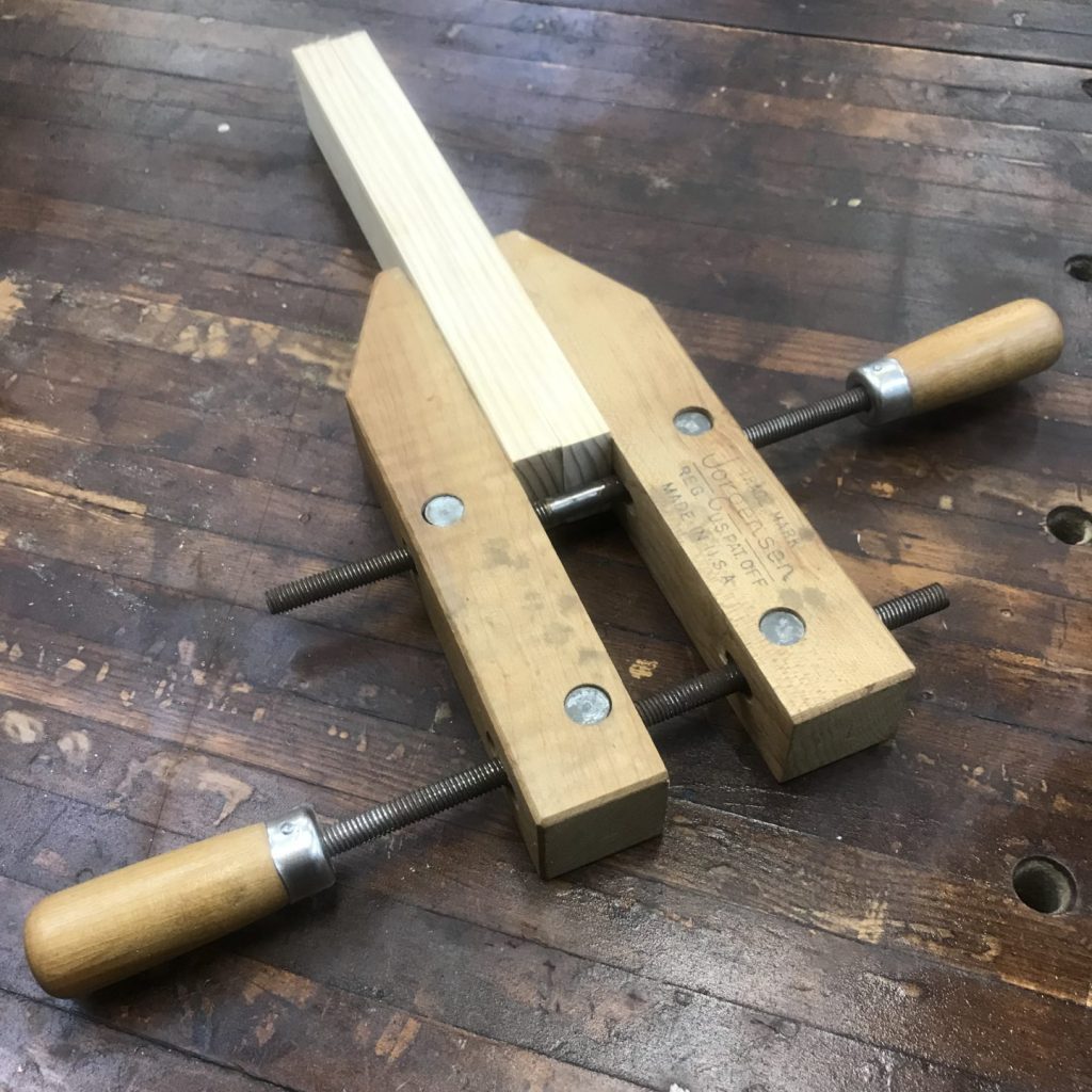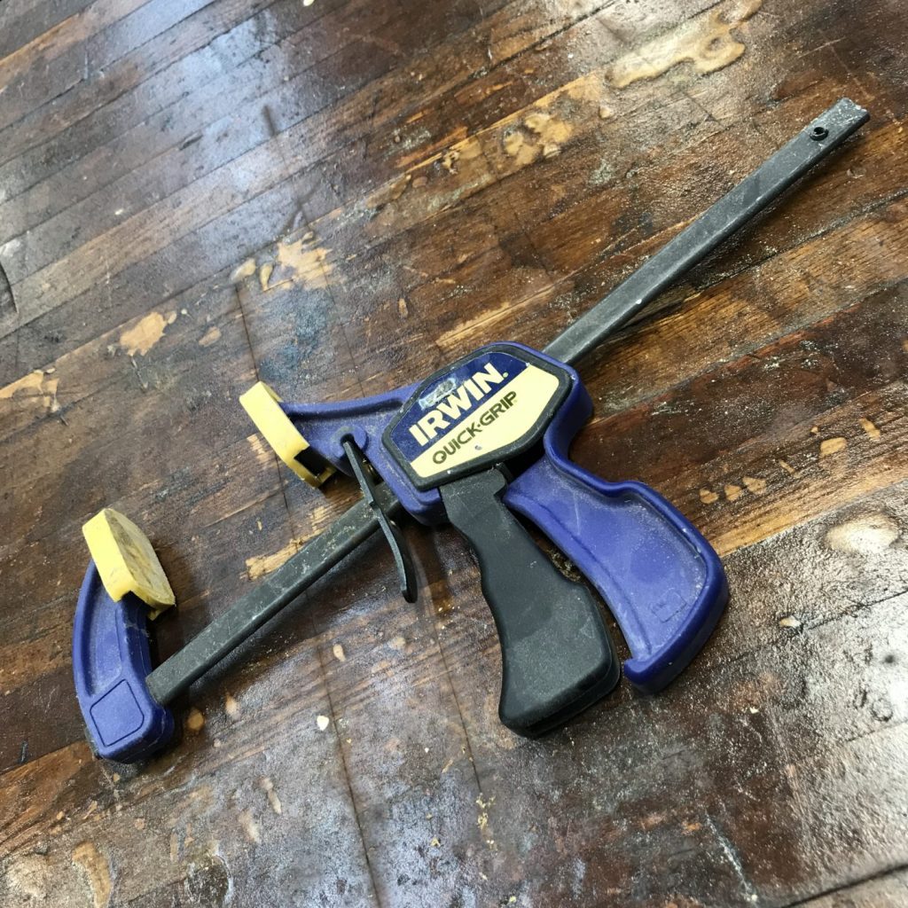 These clamps come in a variety of sizes. I’d recommend building up a collection of half a dozen in the 2-6 inch range. These clamps will also probably require a bit more supervision than spring clamps.