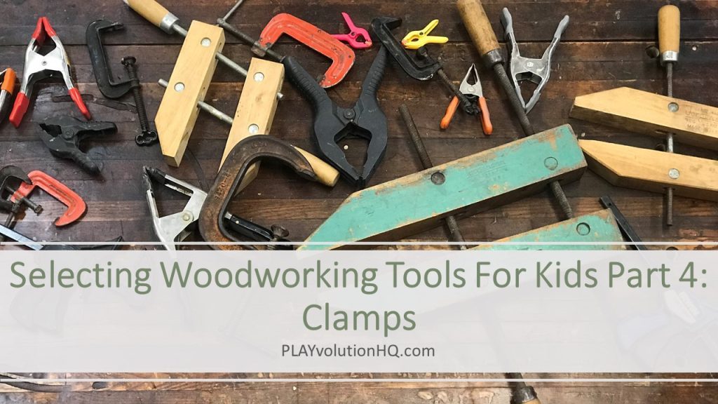 In part 4 of this series, we’re digging in to clamps. (Check out previous posts on Safety Gear, Pounding Tools, and Measuring, Marking, And Leveling Tools.) Clamps are useful tools in woodworking projects and other playful learning activities.