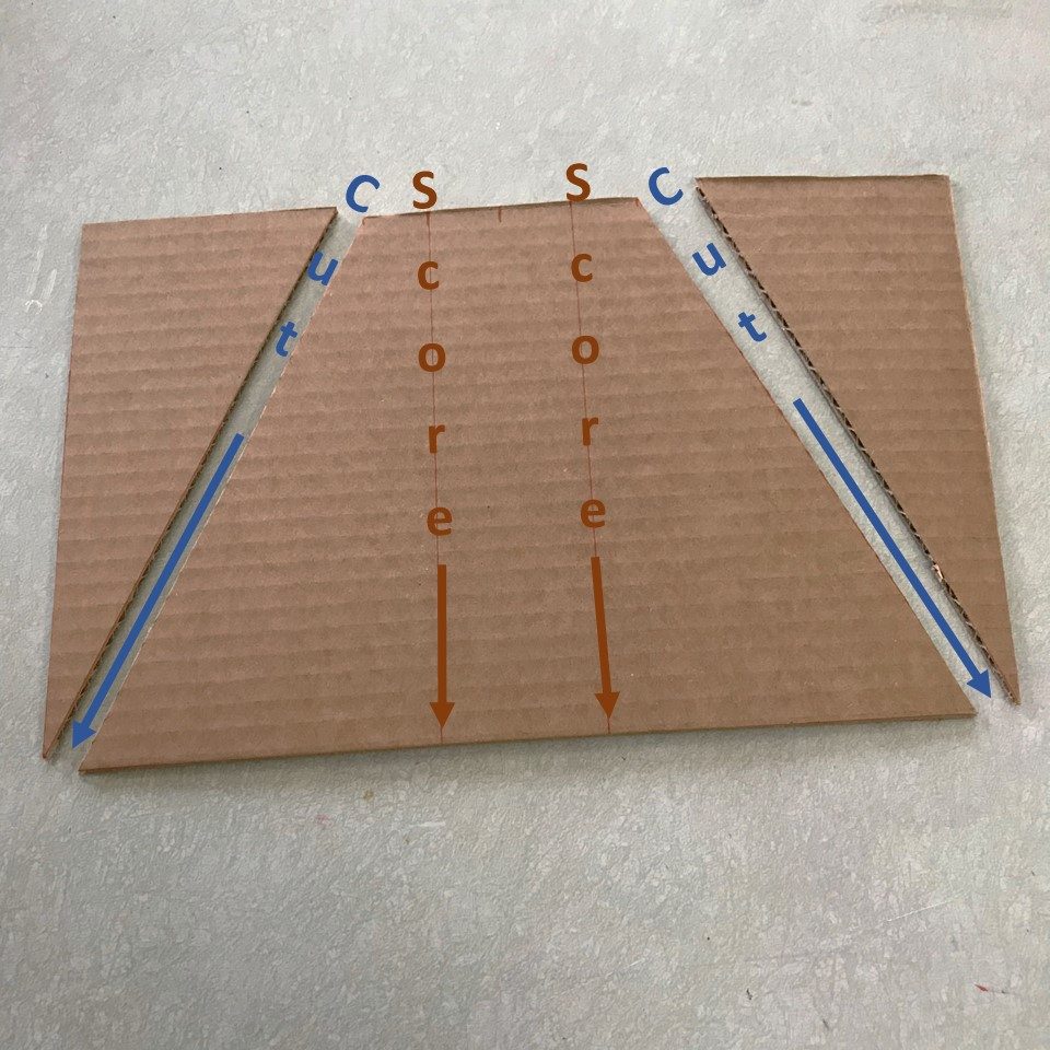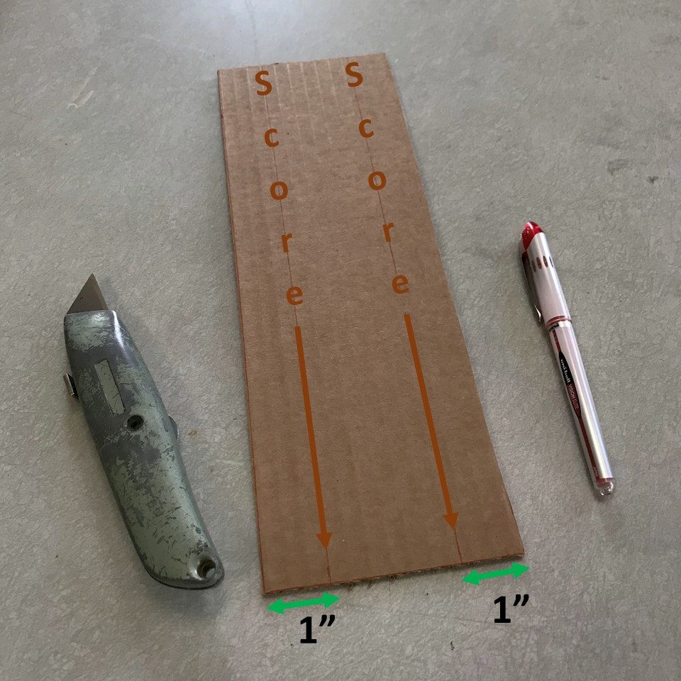 Score lines one inch in on the long sides of the 12-inch by 4-inch piece. The score should slice about halfway through the cardboard. This piece will become the ramp.