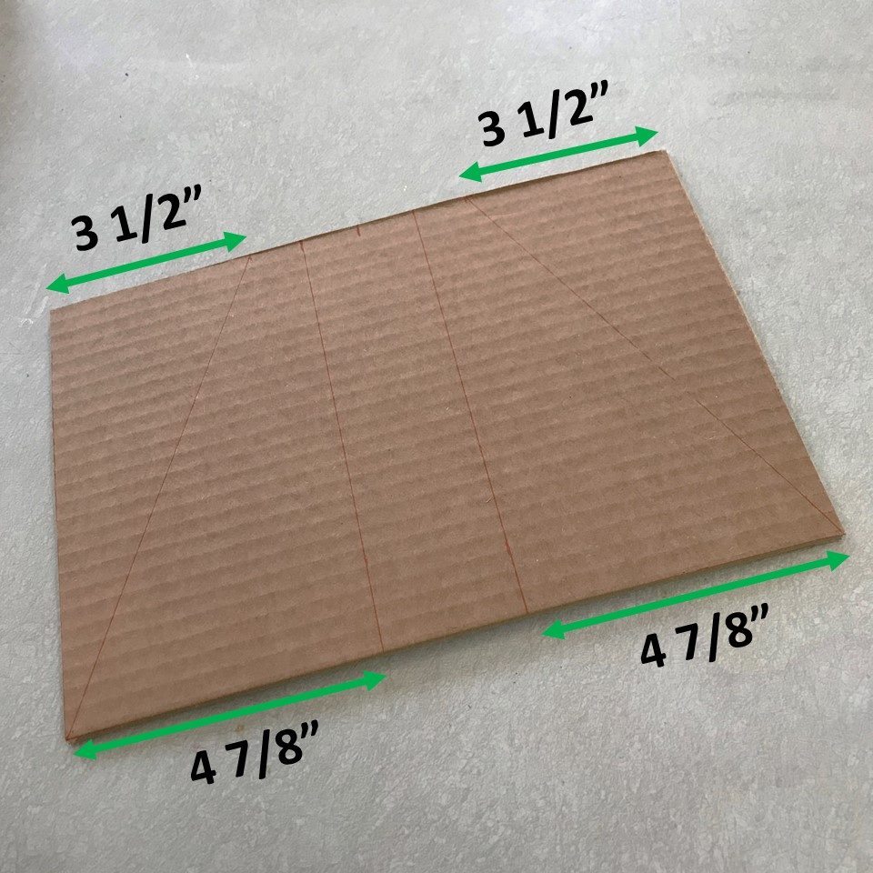 Next, set aside the ramp and lay out the base. Start by measuring 4 7/8 inches from each end along the cardboard’s long side and draw lines parallel to the cardboard’s short sides. After that, measure 3 1/2 inches from each end along the cardboard’s long side and draw a diagonal line to the opposite side. Check the photo below to see how your layout should look.