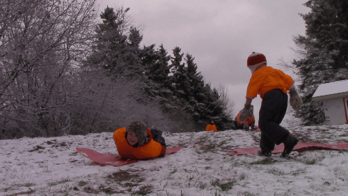 Sledding doesn’t require deep snow or a big hill. The above video was captured at Tir Na Nog Forest School in New Brunswick, Canada back in 2014. They slid until the snow melted.