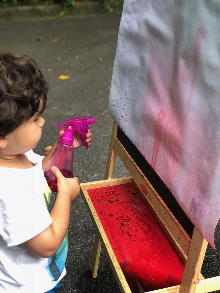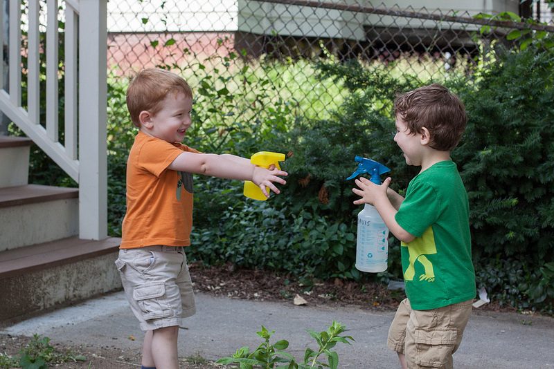 Spray bottles offer a chance to hone visual tracking skills, master small muscle control, expand the understanding of cause and effect relationships, and more. They’re good for spaying water at whatever needs to be wet–plants, rocks, other kids. You can help kids bump up against temperature variations by providing different temperatures of water to spray. Doing so allows them to experience how warm water feels when sprayed on their skin compared to ice water.