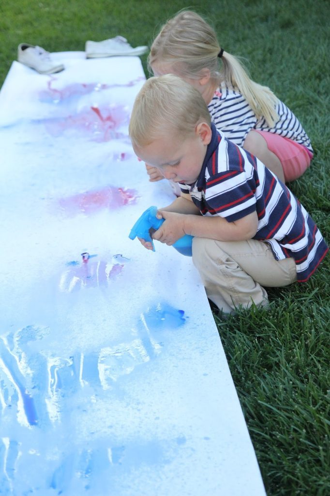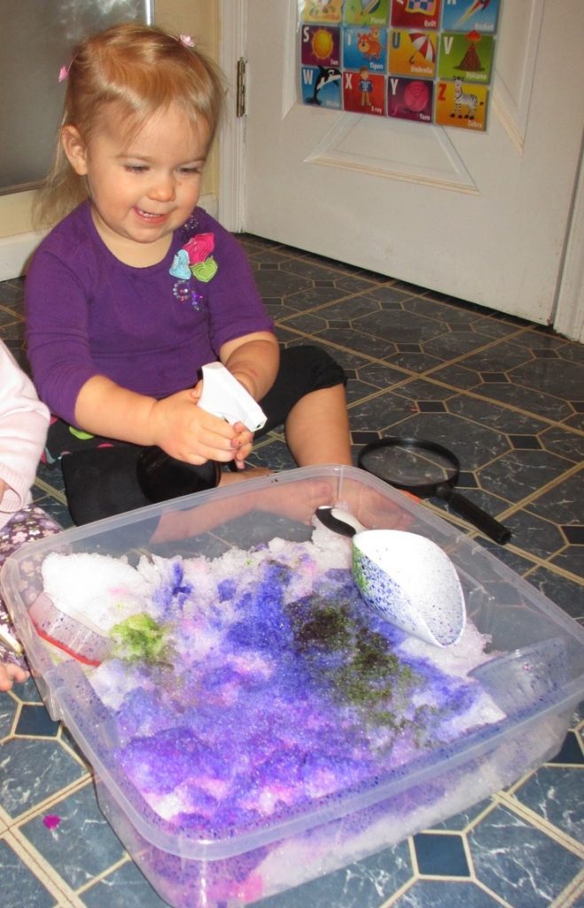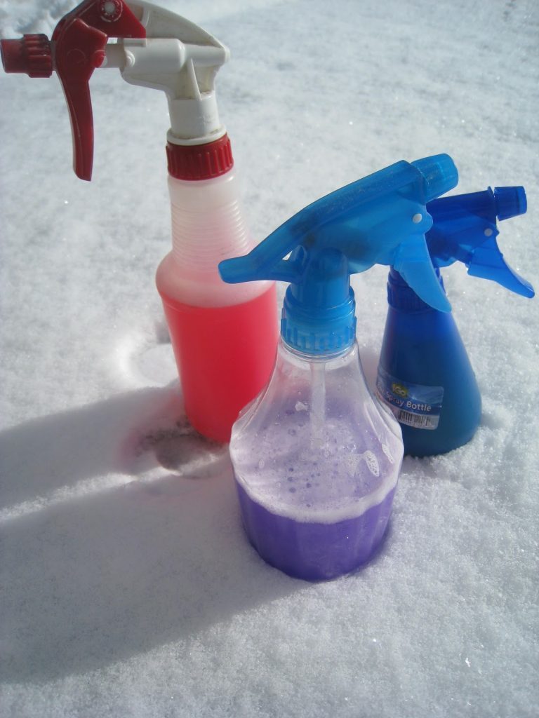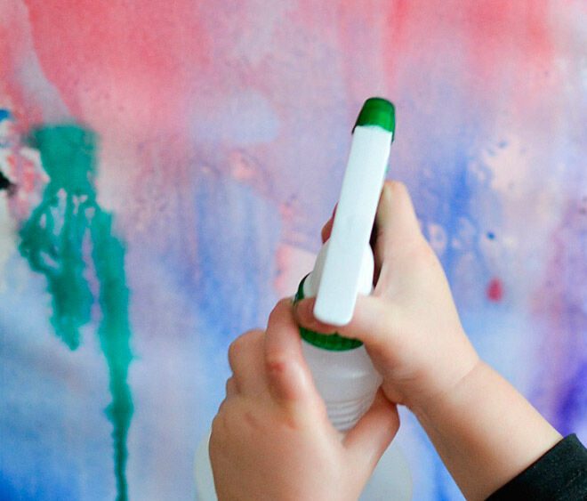 But you can spray more than plain water. Consider experimenting with colored water, diluted paint, or diluted glue. Or vinegar–with a bit of water color added–spayed on to a mound of baking soda.