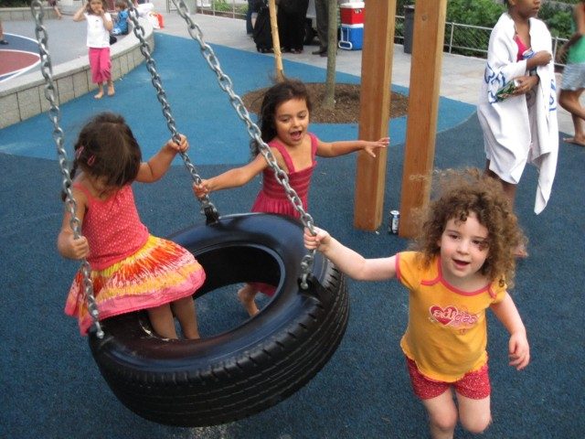 Look how high the seats are from the ground. Look how high off the ground the girl on the far left in the black sweater is. And next to here, we have not only stand-up swinging, but double stand-up swinging–two kids facing each other. How did they get up there?