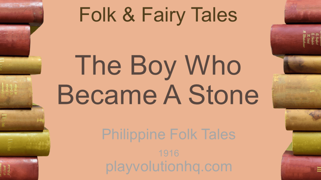 When his grandmother missed the boy, she went out and looked everywhere, hoping to find him. Finally she passed near the stone and it cried out, “Here he is.” Then the old woman tried to open the stone but she could not, so she called the horses to come and help her. They came and kicked it, but it would not break. Then she called the carabao and they hooked it, but they only broke their horns. She called the chickens, which pecked it, and the thunder, which shook it, but nothing could open it, and she had to go home without the boy.