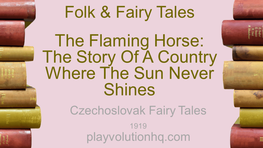 There was once a land that was dreary and dark as the grave, for the sun of heaven never shone upon it. The king of the country had a wonderful horse that had, growing right on his forehead, a flaming sun. In order that his subjects might have the light that is necessary for life, the king had this horse led back and forth from one end of his dark kingdom to the other. Wherever he went his flaming head shone out and it seemed like beautiful day.