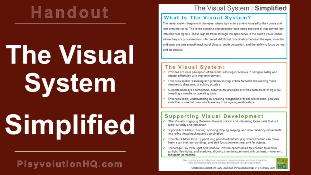 This handout looks at the visual system, which allows the brain to process and interpret light to form images. Light enters through the eye and is converted into electrical signals by photoreceptor cells in the retina before traveling to the brain for interpretation, enabling recognition of shapes, colors, movement, and spatial relationships. This is the fourth in a series of Play Simplified handouts examining the 8 sensory systems. These handouts provide simple definitions of common early learning concepts and ways to support them.
